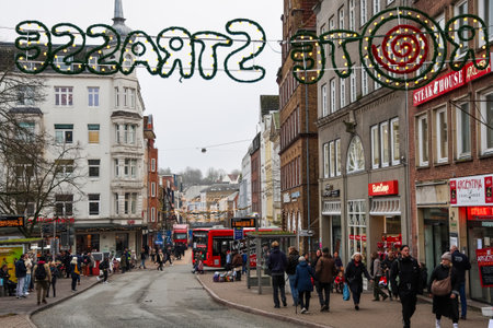 Flensburg, Germany - 21. December 2025: People walking on a busy Flensburg street decorated with festive lights during winter