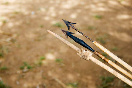 Different poisoned arrows used for hunting by the Hadzabe tribe. Hadzabe tribe threatened by extinction.