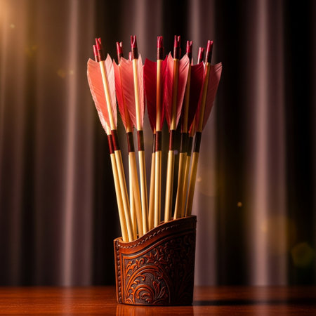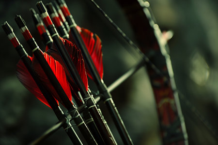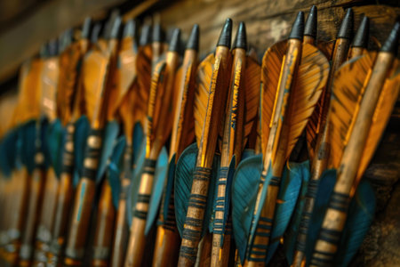 Arrows with fletching illuminated by warm sunlight create captivating scene, showcasing beauty of archery against soft, blurred background. golden hues evoke sense of tranquility and focus
