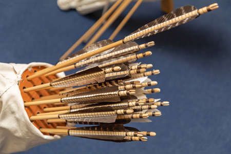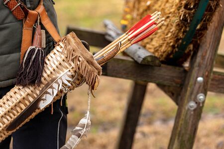 Close-up of an archer with a vintage quiver and wooden arrows - Archery sport, longbow