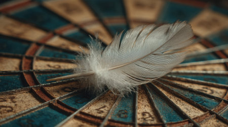 A delicate white feather lies peacefully on a circular target board marked with numbers. The scene captures a moment of calmness and simplicity in a cozy environment.