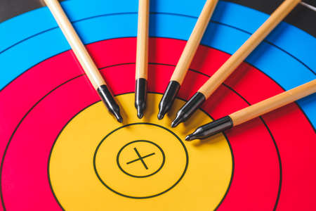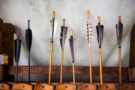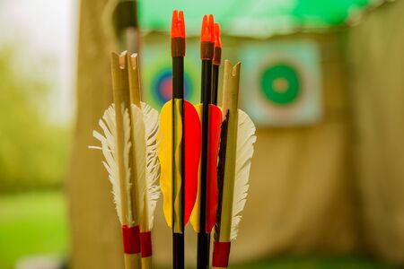 Arrows for archery and crossbow targets. Arrow handmade with natural feathers. National sports entertainment outdoors. Hit target as success of business and Affairs. Funny Nicholas Fortress, Russia