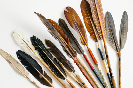 Multiple arrows with colorful feathers at the ends. High quality photo