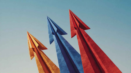 Three colorful arrows in blue, red, and yellow stretch towards the clear sky, symbolizing direction and inspiration in a modern artistic style.