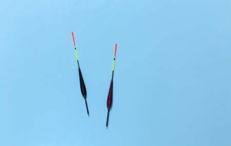 Red plastic dart with metal tip on blue pastel background with copy space. top view. flat lay. minimalism