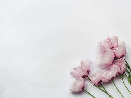 Flowers on a gray background, top view, copy space.