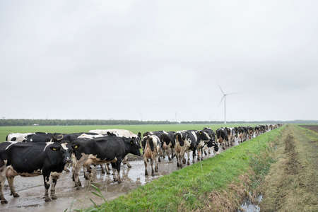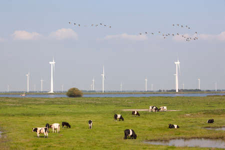 cows and wind turbines near Spakenburg in typical landscape of the Netherlands