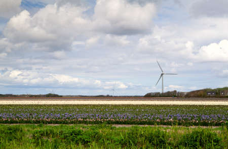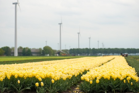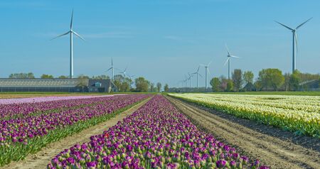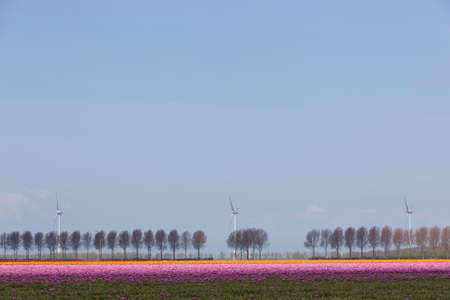 Tulip fields with wind turbines in the Netherlands. nature background
