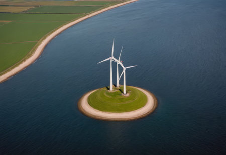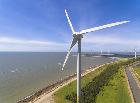aerial view of Wind turbines on the coast