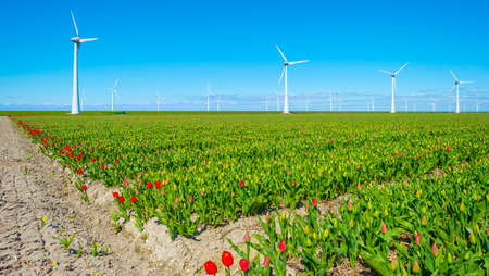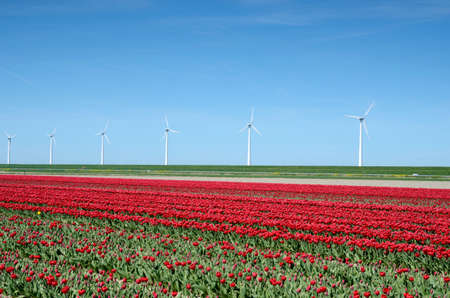 A colorful bed of red Dutch tulips. In the background Windmills for the production of sustainable energy. Landscape with tulips in the Noordoostpolder, Netherlands, Europe.