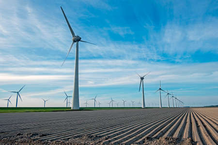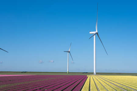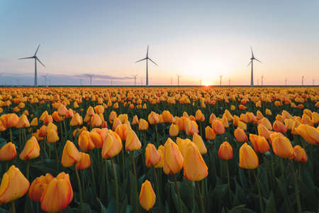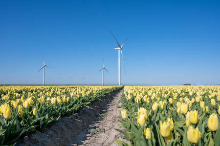 Windmill turbines and blooming tulips in Noordoostpolder Flevoland during a sunny spring day