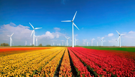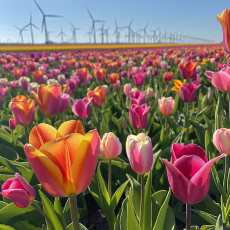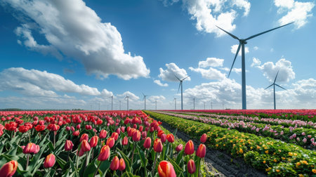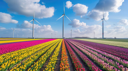 Colorful Tulip Field with Wind Turbines on a Sunny Day Spring Bloom and Renewable Energy.