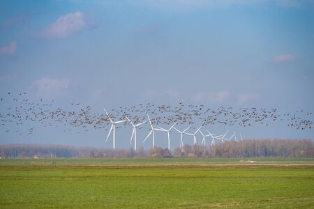 row of wind turbines with a flock of birds passing by