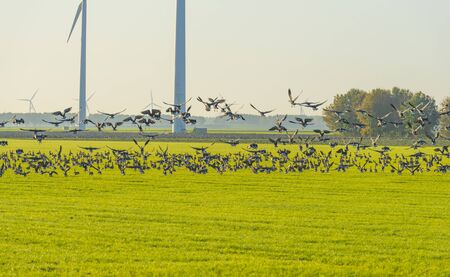Birds flying over a field with wind turbines in sunlight at fall