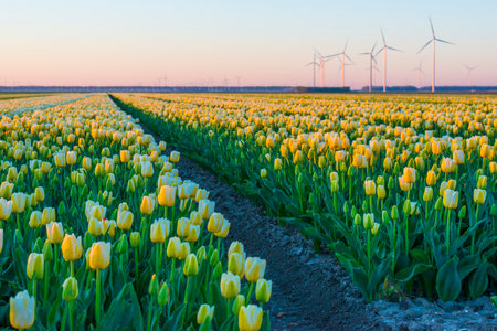 Tulip fields and rows of grand Wind Turbines at dusk in Noordoostpolder part of Netherlands