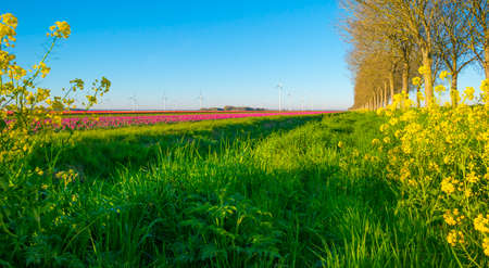 Colorful flowers in an agricultural field in sunlight at sunrise below a blue sky in springtime, Almere, Flevoland, The Netherlands, April 17, 2022