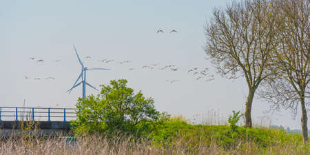 Flock of geese flying over a bridge and trees in a blue sky in sunlight in springtime, Almere, Flevoland, The Netherlands, April 24, 2022