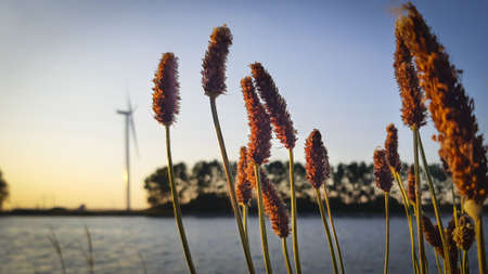 The image showcases wind turbines positioned along a waterway at sunset. The composition displays vibrant colors and textures, with the sun casting a warm glow across the sky and reflecting in the water. This scene suggests an outdoor environment and is suitable for various commercial and editorial applications, emphasizing renewable energy.