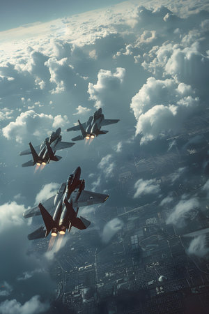 Several jet airplanes leave white vapor trails across a bright, cloud-filled blue sky. The composition emphasizes diagonal lines and negative space. The image features natural light and a broad atmospheric perspective, suitable for travel, aviation, or background visuals. Ideal for commercial applications.