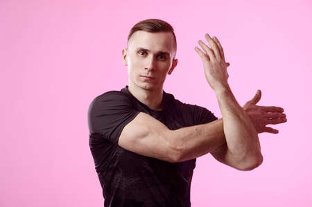 Sporty strong man stretching arm before gym workout on colorful background. Fitness strong male athlete standing indoor warming up.