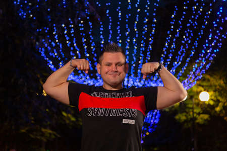 young fitness strong man show biceps muscles on hand