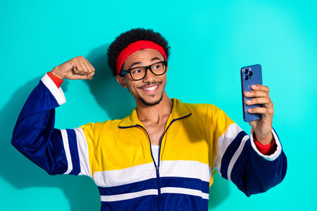 Young Athlete Posing for Selfie in Retro Activewear Against Turquoise Background, Happy and Confident