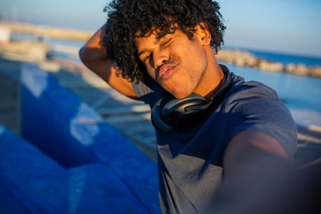Portrait of goodlooking young African athlete wearing stylish shades and black outfit looking happy and cheerful sitting on sidewalks at sea waiting for his friend to joi : Generative AI