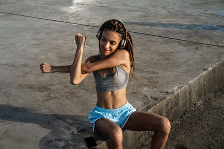 Young african sportswoman in headphones exercising outdoors at the beach pier