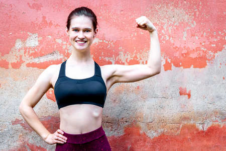 Girl in sport top show arm muscules. Smiling, near red wall copy space