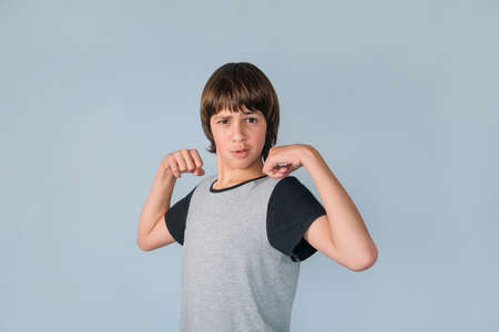 Portrait of Teenage Boy Flexing His Biceps with Cheeky Fun Look on His face Blue Background with Copy space
