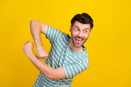 Photo of young handsome funny smiling man look for new adventures laugh dancing isolated on bright yellow color background