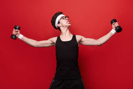 Funny skinny man exercising with dumbbells