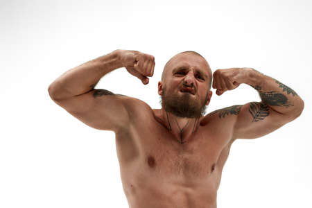 A bearded man flexes his bicep against a white backdrop. His determined expression and strong arm convey power and confidence.