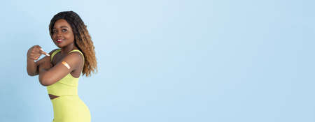 Side view of young african american woman girl in casual t-shirt posing isolated on blue background studio portrait. People emotions lifestyle concept. Mock up copy space. Showing biceps, muscles.