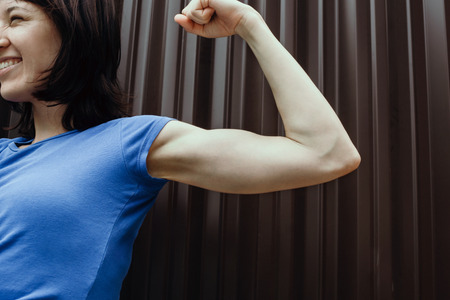 Smiling woman flexing her biceps outdoors, selective focus