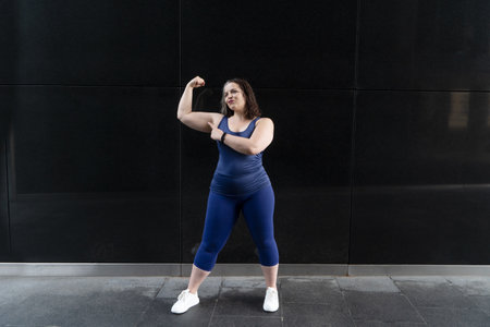 Woman and sports, exercise for weight loss in the fresh air. Poertrait of happy curvy woman doing workout routine