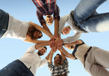 Close up low angle view photo business people round circle she her he him his hold hands arms fists together celebrate project prize nomination power inspiration all dressed formal wear jackets shirts