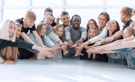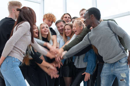 Group of school friends forming star shape with their hands, symbolizing unity and teamwork