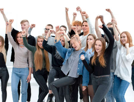 Happy diverse business team standing hands up on beige studio background. Banner with group portrait of cheerful multicultural coworkers with arms raised. Success, positivity and diversity concept
