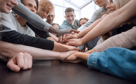 Circle of school friends joining hands, symbolizing unity, teamwork, and friendship
