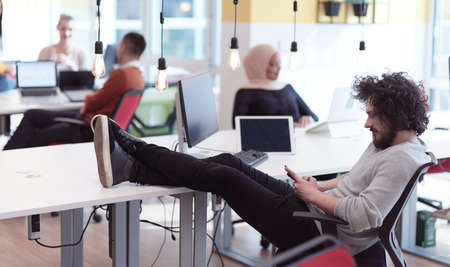 Group of multiethnic colleagues working on desktop computers in a modern office space. Girl resting with feet on table