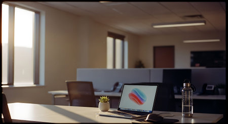 A bright, minimalist office space featuring a laptop on a desk, water bottle, and potted plant. Cubicles and natural light from windows.