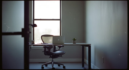 A simple home office setup with a laptop on a desk, office chair, and a small plant. The room is lit by natural light from a window.