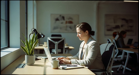 A focused woman in a blazer typing on a laptop in a bright, contemporary office. A plant and coffee cup are on the desk, with other professionals working in the background.