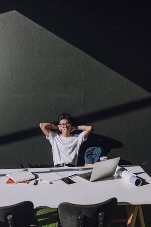 Young male architect on construction site checking documents and business workflow using laptop computer with cardboard boxes around him in new startup office
