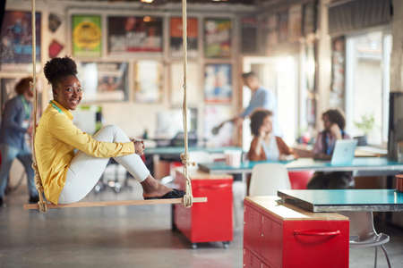 A young beautiful woman is sitting on the swing and posing for a photo in a pleasant atmosphere in the office