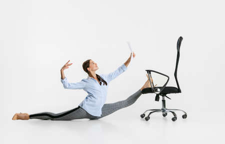 Full-length portrait of woman, office worker sitting on s twine isolated over white background.