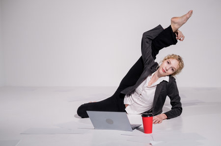 Barefoot ballerina dressed in a business suit poses for a laptop and drinks coffee. Flexible woman works at the computer.