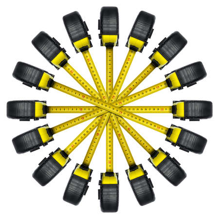 Large group of black and yellow Tape Measures arranged radially and isolated on white background. Photography.