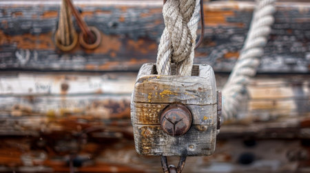 The worn and weathered texture of a wooden block its pulleys and rigging essential for maneuvering the sails